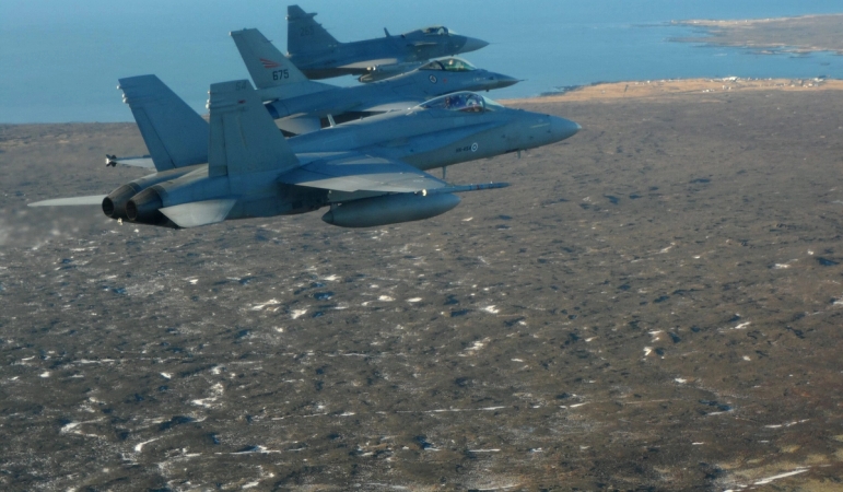 Bilde 2: Det nordiske militære samarbeidet har så langt knapt levert en brøkdel av det som er potensialet. Bildet viser et svensk JAS 39 GRIPEN, et norsk F-16 FIGHTING FALCON og en finsk F-18 HORNET i formasjon under Iceland Air Meet i 2014 Foto: 212.sfdiv/Försvarsmakten Sverige