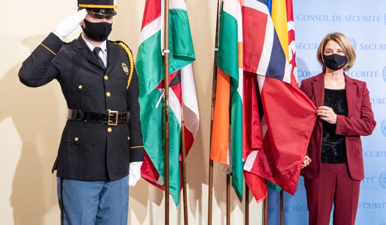 Norge har nylig tatt plass i FNs sikkerhetsråd, noe som gir økt behov for god kunnskap om verden. Bildet viser FN-ambassadør Mona Juul setter opp det norske flagget utenfor Sikkerhetsrådet.